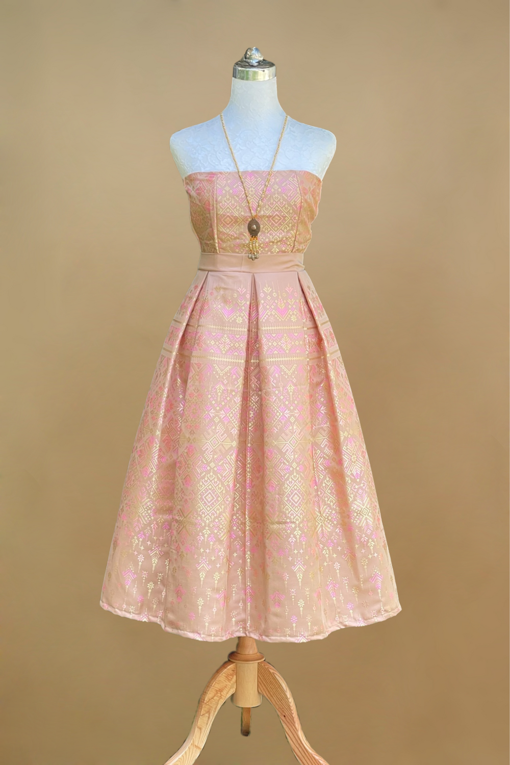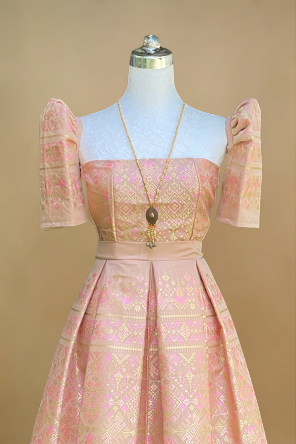 This exquisite dress is crafted from traditional Thai silk brocade, featuring luxurious pink and gold woven patterns. Its butterfly sleeves and pleated A-line skirt evoke cultural elegance with a modern twist. Perfect for weddings, formal occasions, and cultural events, this artisan-made piece offers timeless beauty and exceptional craftsmanship in every detail.