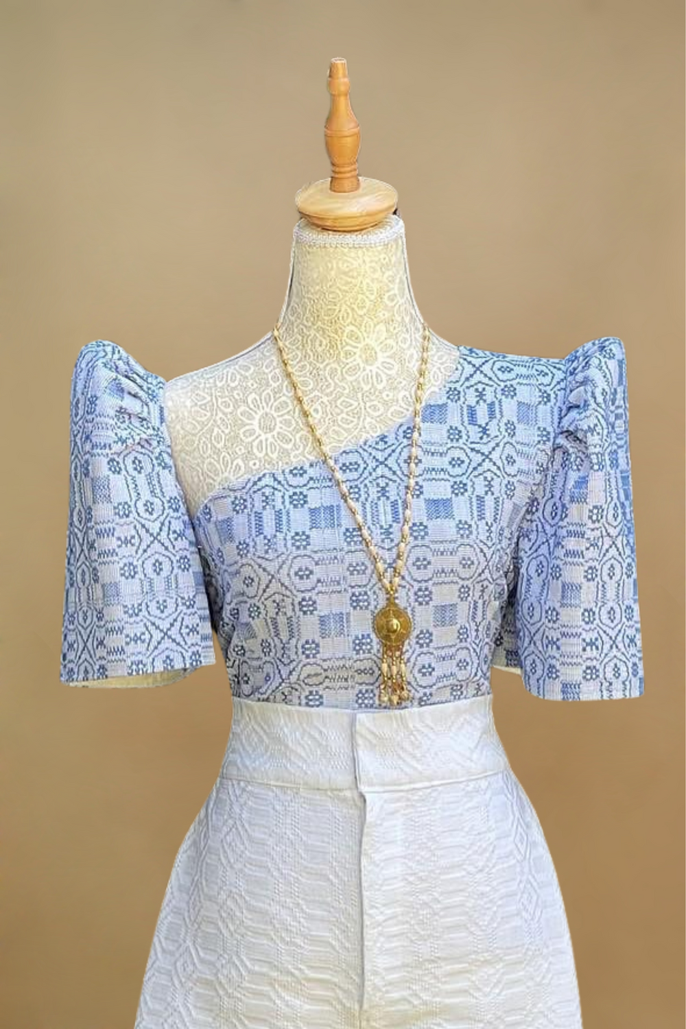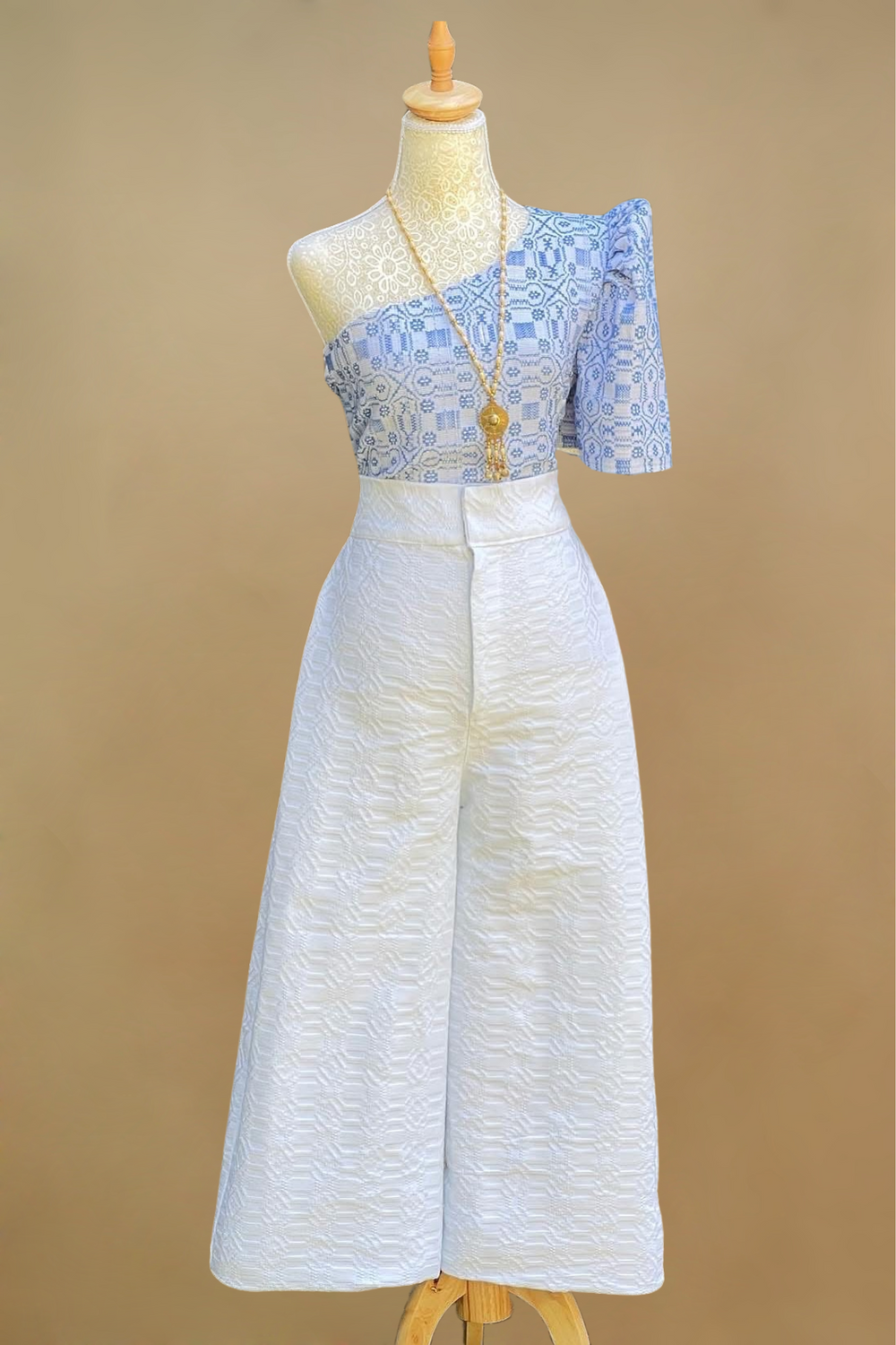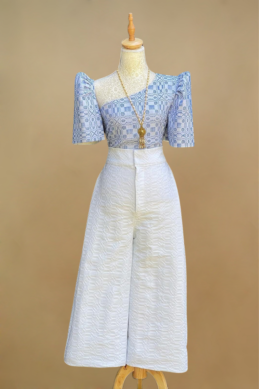 This modern Filipiniana Set features a woven geometric top and structured wide-leg pants made from textured woven fabric. Highlighting a versatile off-shoulder or classic butterfly sleeve design, it’s perfect for cultural events, weddings, and formal occasions. A stylish fusion of heritage and contemporary fashion designed for elegant empowerment.
