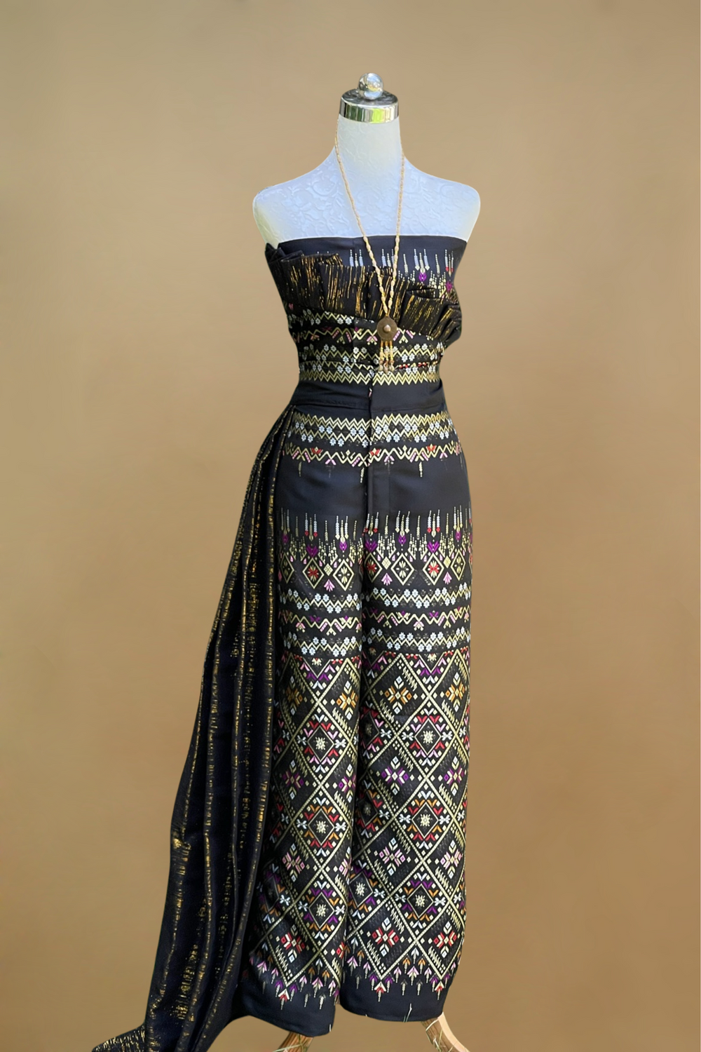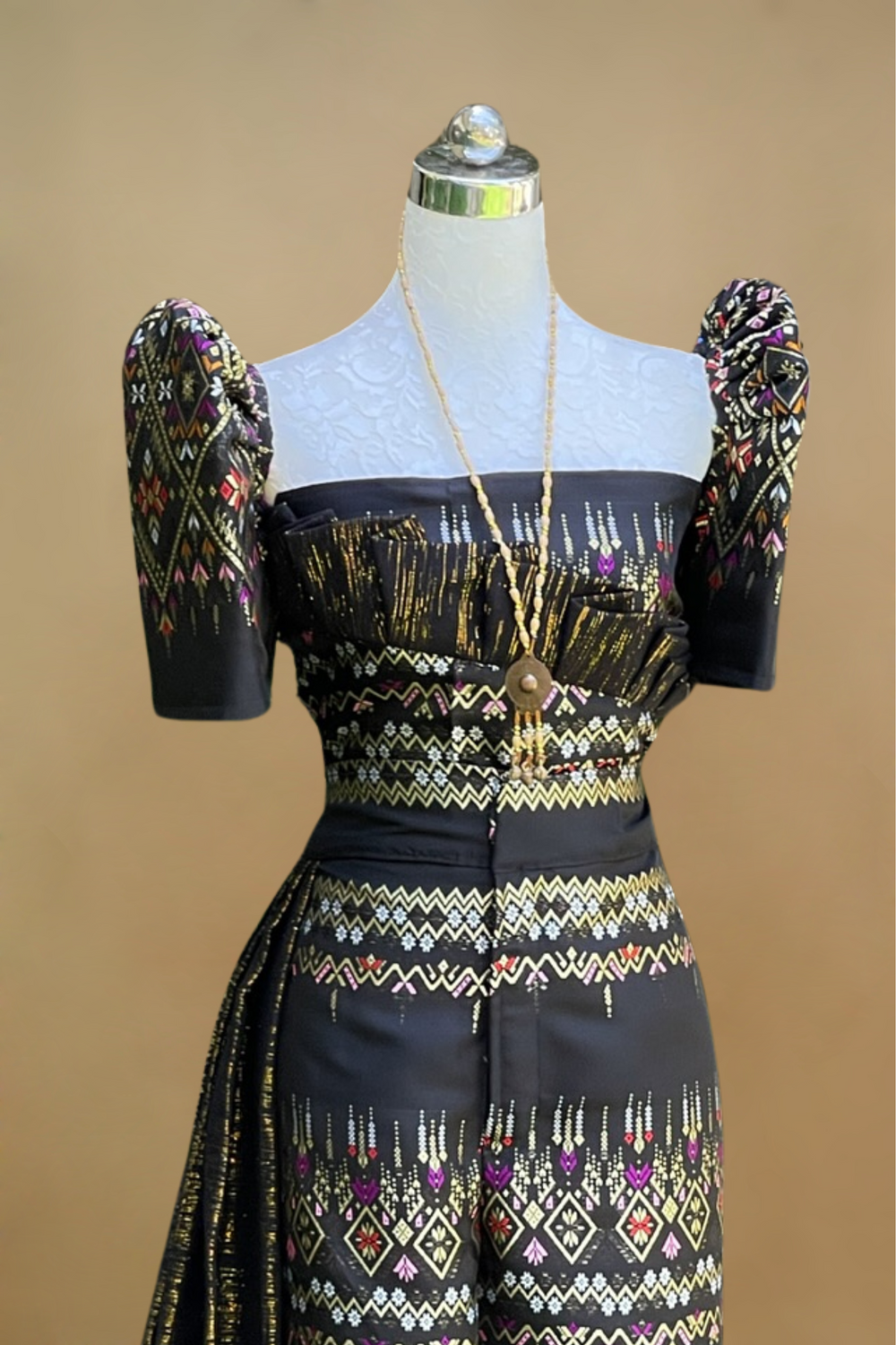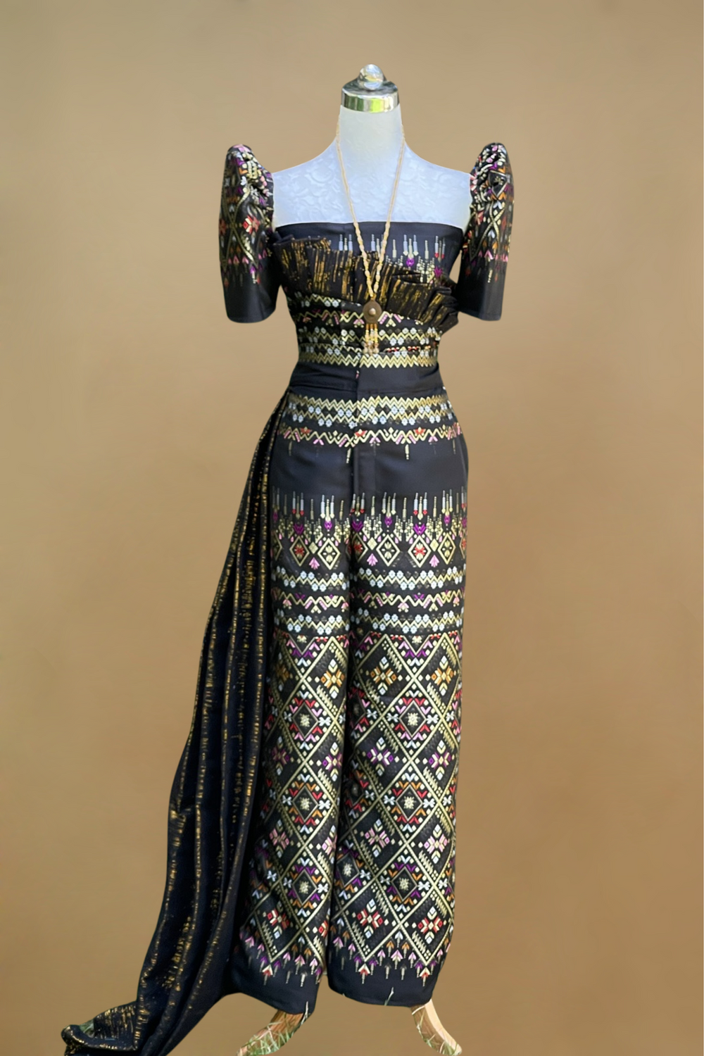 Experience cultural luxury with this Filipiniana set crafted from traditional Thai silk brocade. The design features rich black fabric adorned with intricate gold and multicolor motifs, iconic butterfly sleeves, and a draped sash accent. Perfect for weddings, formal celebrations, and cultural events, it blends timeless Filipino elegance with opulent Thai craftsmanship.