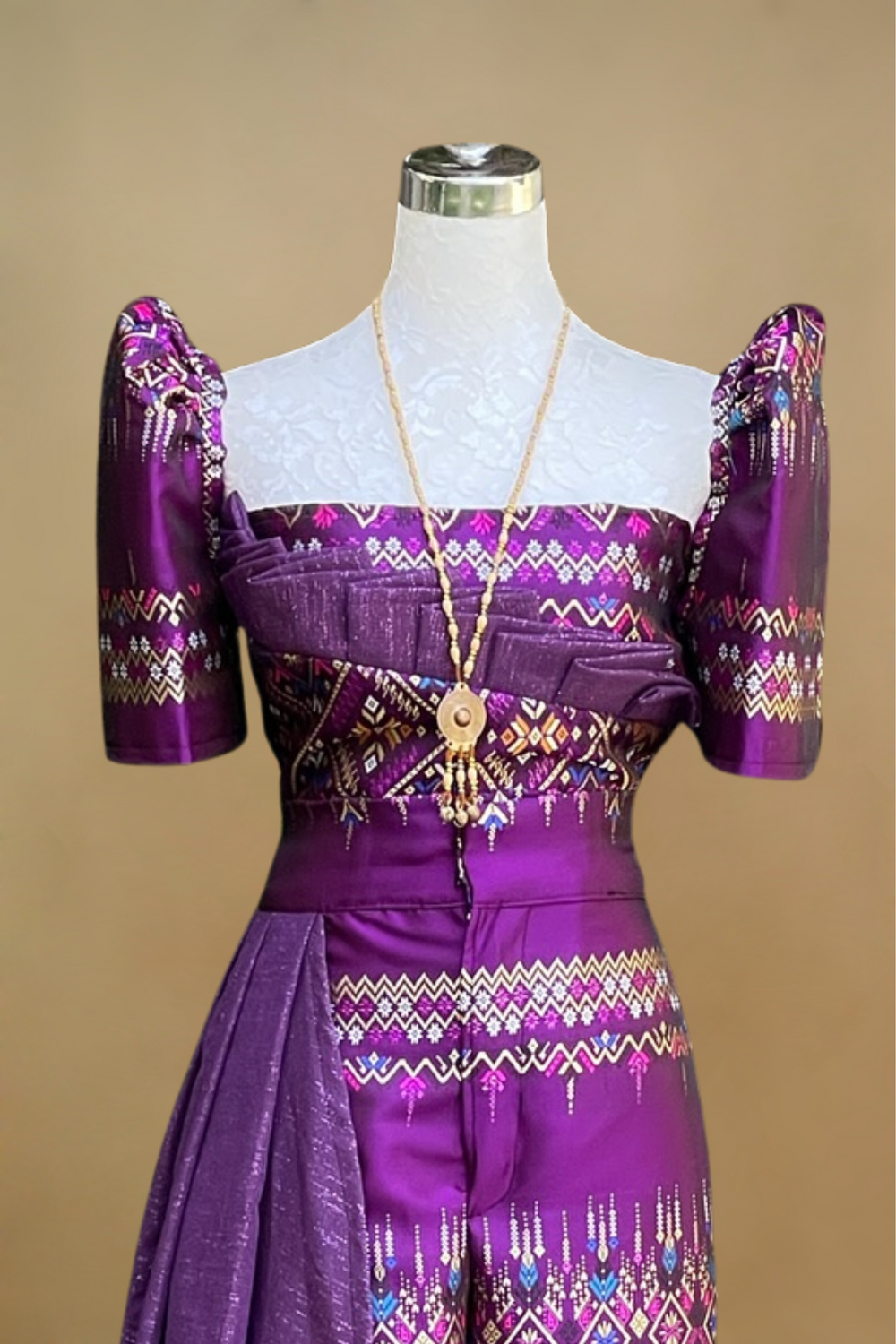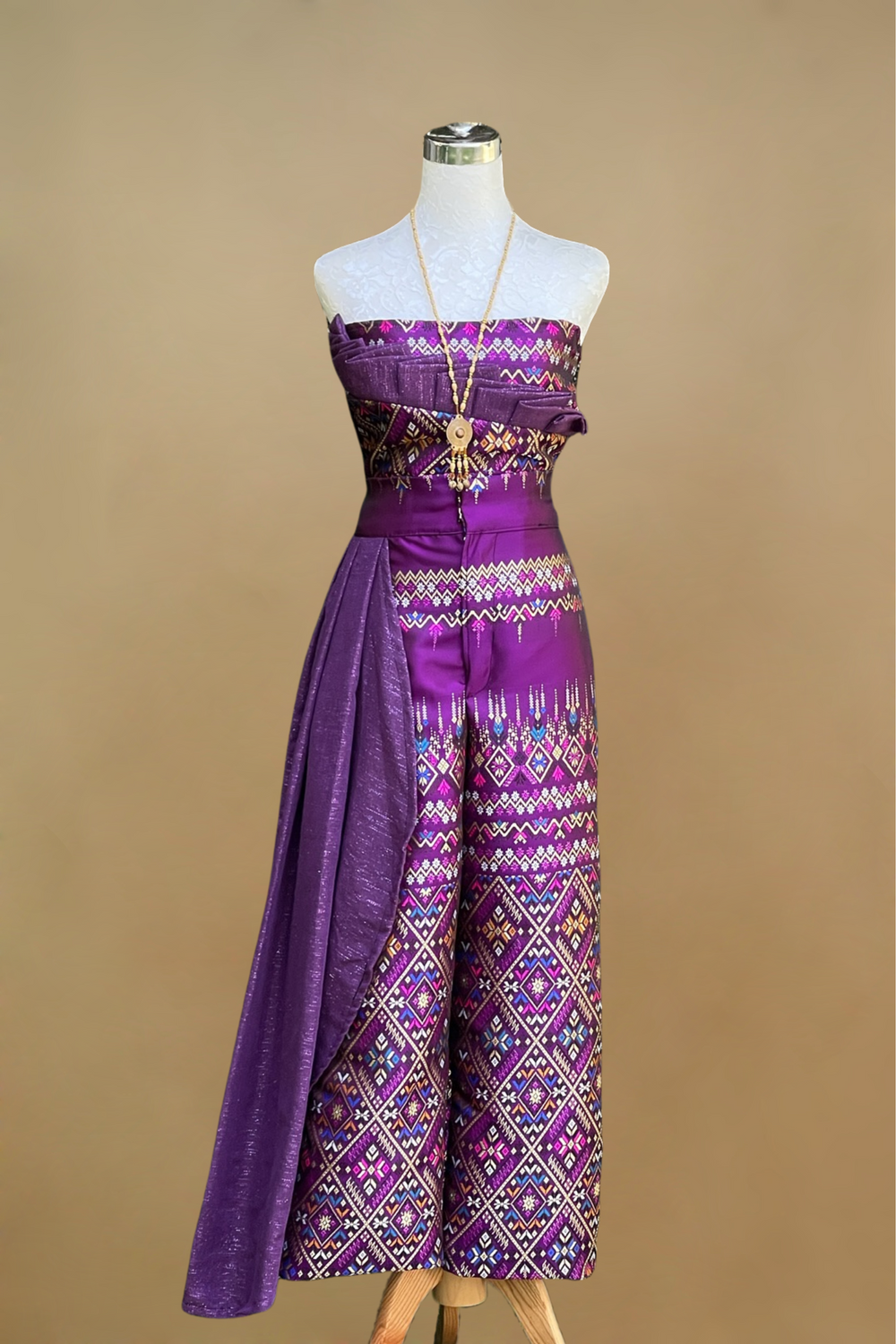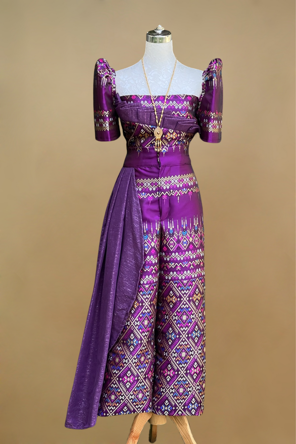 Showcasing exquisite Filipino artistry, this Filipiniana set is crafted from luxurious handwoven fabric with intricate geometric patterns in royal purple and gold. Featuring signature butterfly sleeves, a fitted bodice, and wide-leg trousers with an elegant drape, it’s perfect for weddings, cultural events, and formal occasions celebrating heritage with modern sophistication.